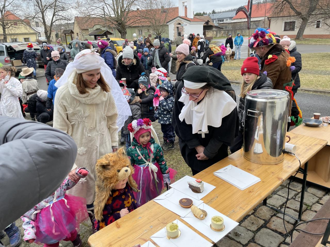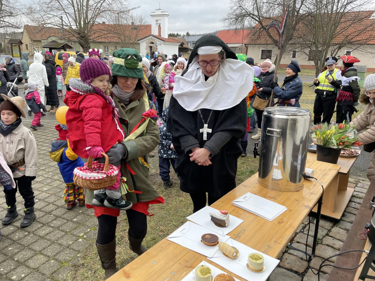 Na návsi se ve tři čtvrtě na dvě sešly děti, aby se připravily na úvodní předtančení, které sklidilo velký úspěch. Následovalo vtipné hudební vystoupení Třebasboru. Moc děkujeme! A protože byla opravdu zima, Olda Burda zajistil diskotéku pro zahřátí dětí i dospělých, během které probíhaly znalostní soutěže a hlavně soutěž masek o výborné dortíky z Malé pekárny pod taktovkou našich hasičů – a jejich skvělého punče. A že bylo mnoho krásných a důmyslných masek – minecrafťák, hygienička, kominíček, mini Masopust, spousta zvířátek, policistka s pirátem... Klobásky a uzené zde zajistila paní Blanka Váňová, Péťa Flasarová upekla své všemi oblíbené zelňáky a nechyběly starostovské sýrové rohlíčky.