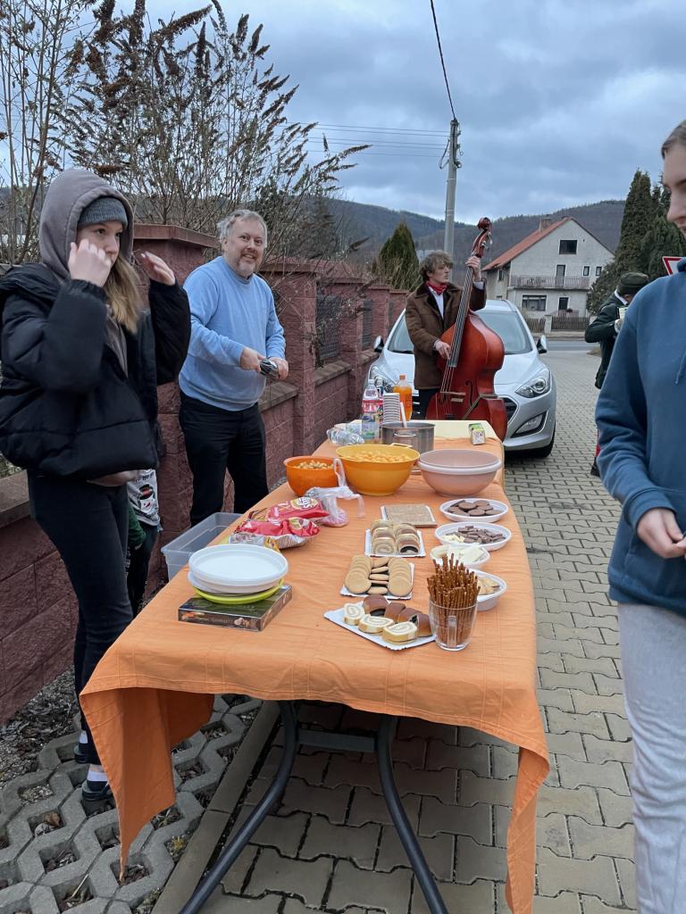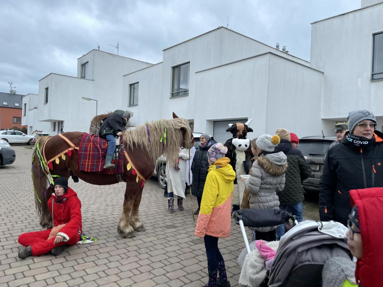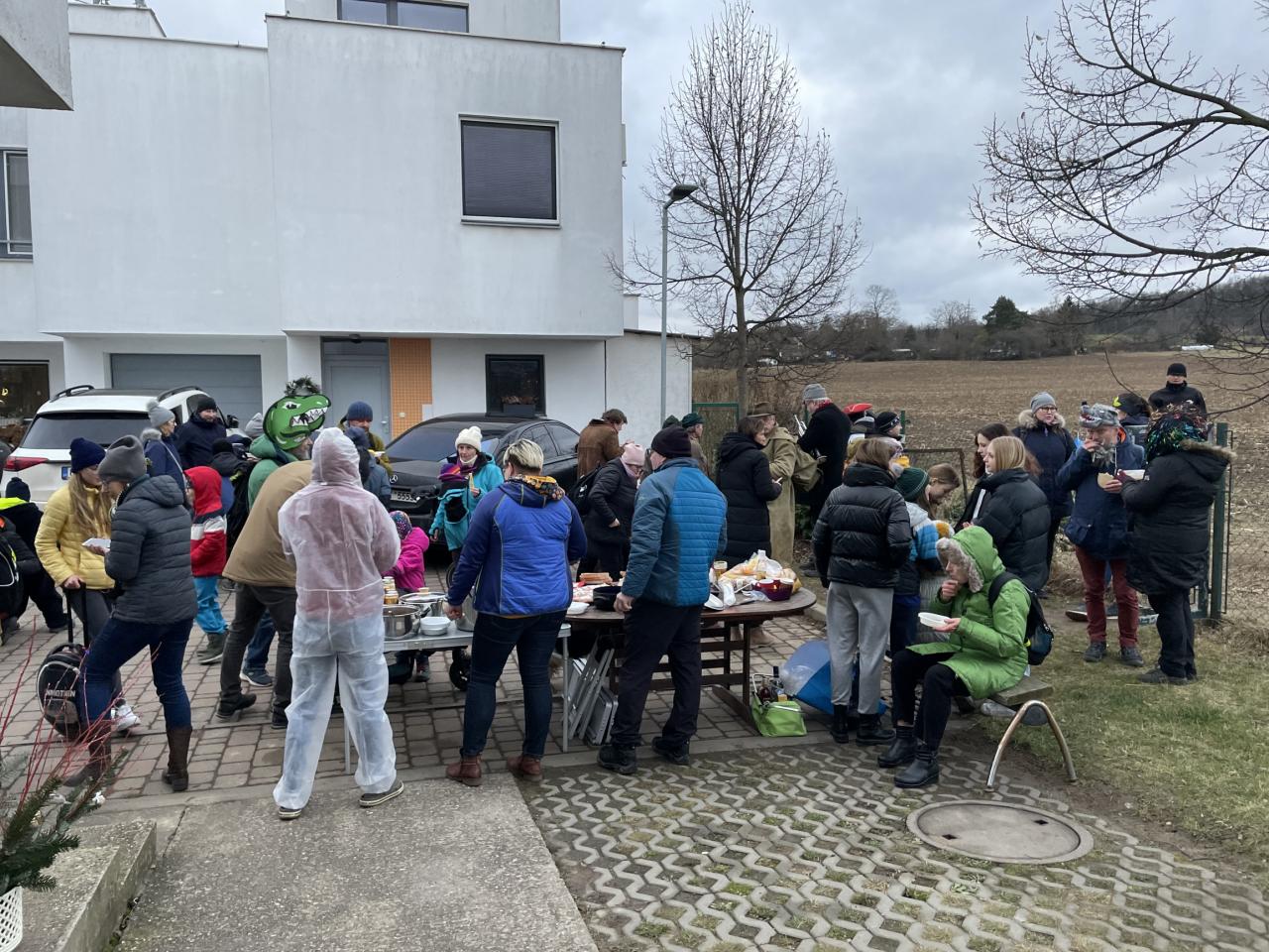 Následně jsme se vrátili na stálou trasu zpět přes náves do hasičárny na koblížky pro děti a hruškovici pro dospělé. U hasičárny se k nám přidal koník Norman, aby nás doprovodil k Brunclíkům. Tam na nás čekala oblíbená škvarková pomazánka. Další zastávkou byly „bílé kostky“ a zde mj. tradiční kyselica od Vrábliků. Pomalu se začínalo stmívat a poutníci, kteří měli v nohách skoro osm kilometrů, se zastavili u Kričků, kde děti s tatínkem Davidem připravily barevnou hostinu, a konečně nás čekala cílová sokolovna, kde Tesařovi a Möseovi přichystali cílové občerstvení i teplo z klubových kamen.