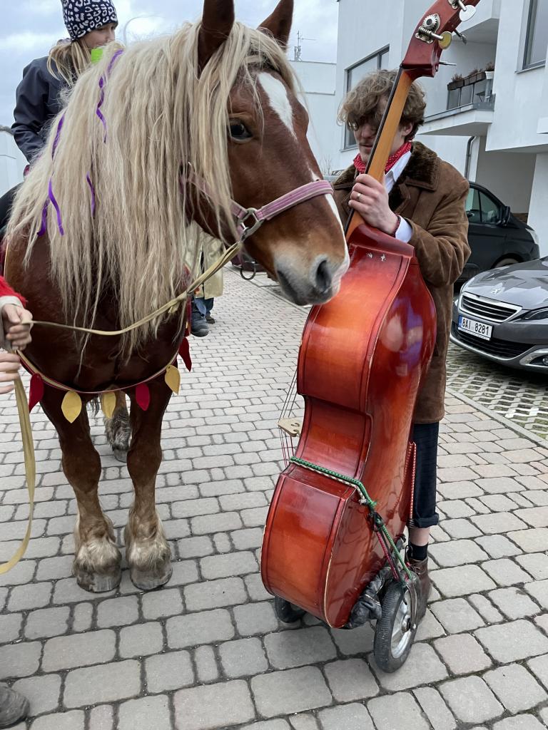 Po hodině řádění masek na návsi se vydal průvod pod vedením lemura a hudebního doprovodu kapely Třehusk na úplně novou trasu obcí díky nově zapojeným zastávkám v Karlické ulici – u Brožků, v MMX a v Malé pekárně. Brožkovi nabízeli mj. výborné borůvkové koláče, MMX letovské pivo a malá pekárna pekáče buchet s jitrnicemi a zelím, mňam :-)