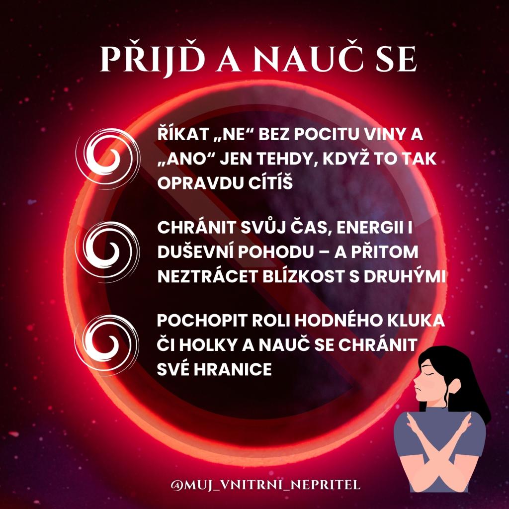 Naučte se říkat „ne“ bez pocitu viny a „ano“ jen tehdy, když to tak opravdu cítíte. Praktická a lidská přednáška o tom, jak si chránit svůj čas, energii i duševní pohodu – a přitom neztrácet blízkost s druhými. Přijďte si pro úlevu, odvahu a konkrétní nástroje, jak si konečně nastavit zdravé hranice.